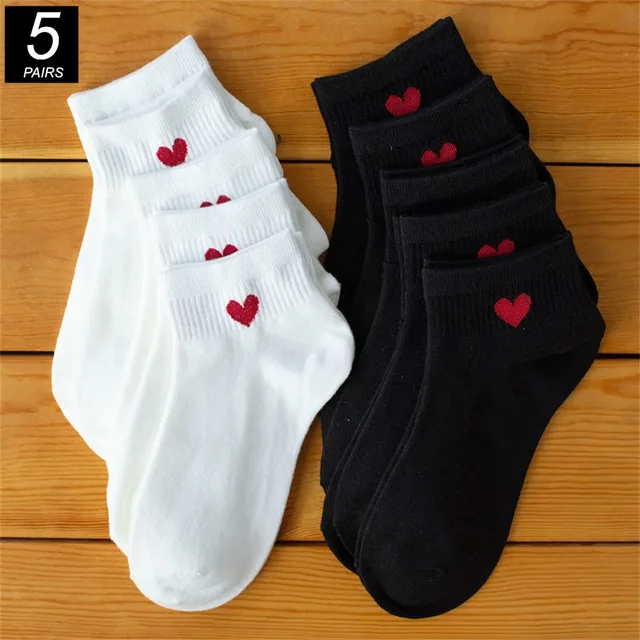 5 Pairs Black White Ankle Socks Women Spring Summer Low Tube Cotton Boat Socks Cute “Love Heart” College JK Girls Socks