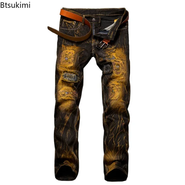 Men’s Regular Fit Stacked Jeans Ripped Slim Fit Patch Distressed Destroyed Straight Denim Pants Hip Hop Streetwear Trouser Cloth