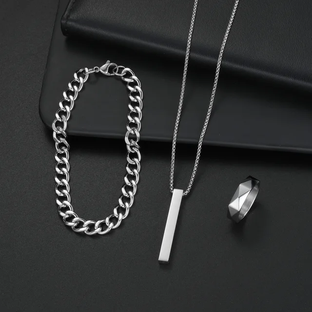3pcs Stainless Steel Suit Jewelry Set For Men, Hip-hop Rectangle Pendent Necklace, Bracelet And Ring Set