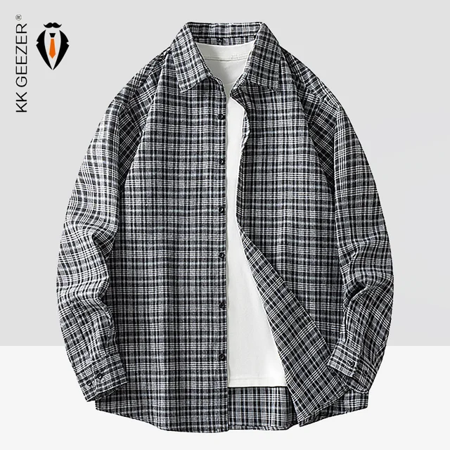 Men Shirt Plaid Flannel Retro Long Sleeve Oversized Loose Cotton Casual Male Youth Design Soft Fall Black Formal Dress Shirt