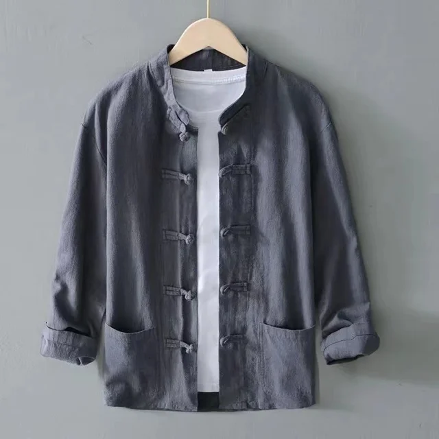 XXXXXL Plus Size Men Cotton Linen Shier Autumn Spring Men Collarless Long Sleeve Frog Button Loose Blouse Tops Oversized M-5XL
