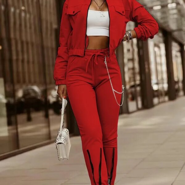 Women’s Spring Summer New Fashionable Zipper Design Long Sleeve Top+Drawstring Pants Casual Two Piece Pants Set