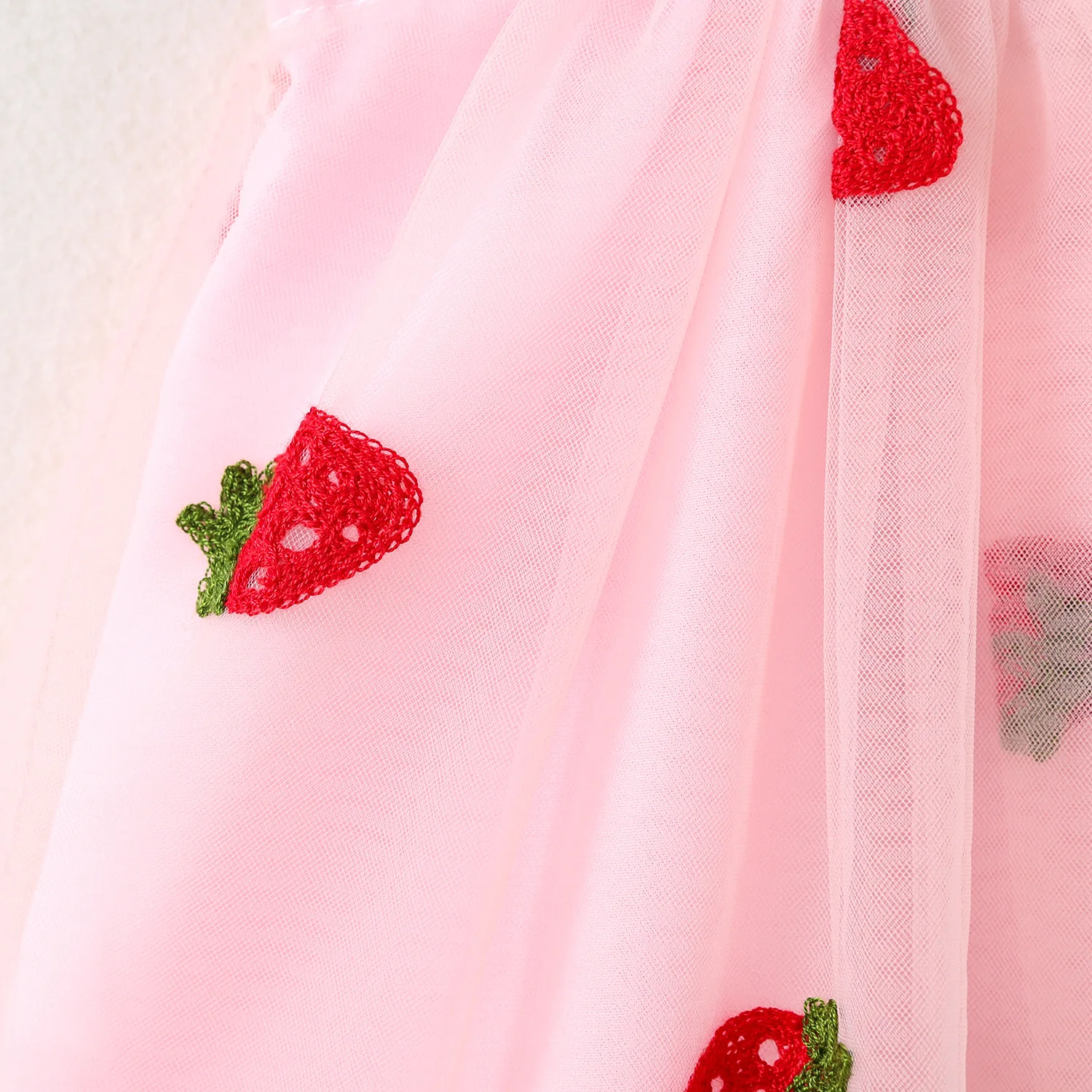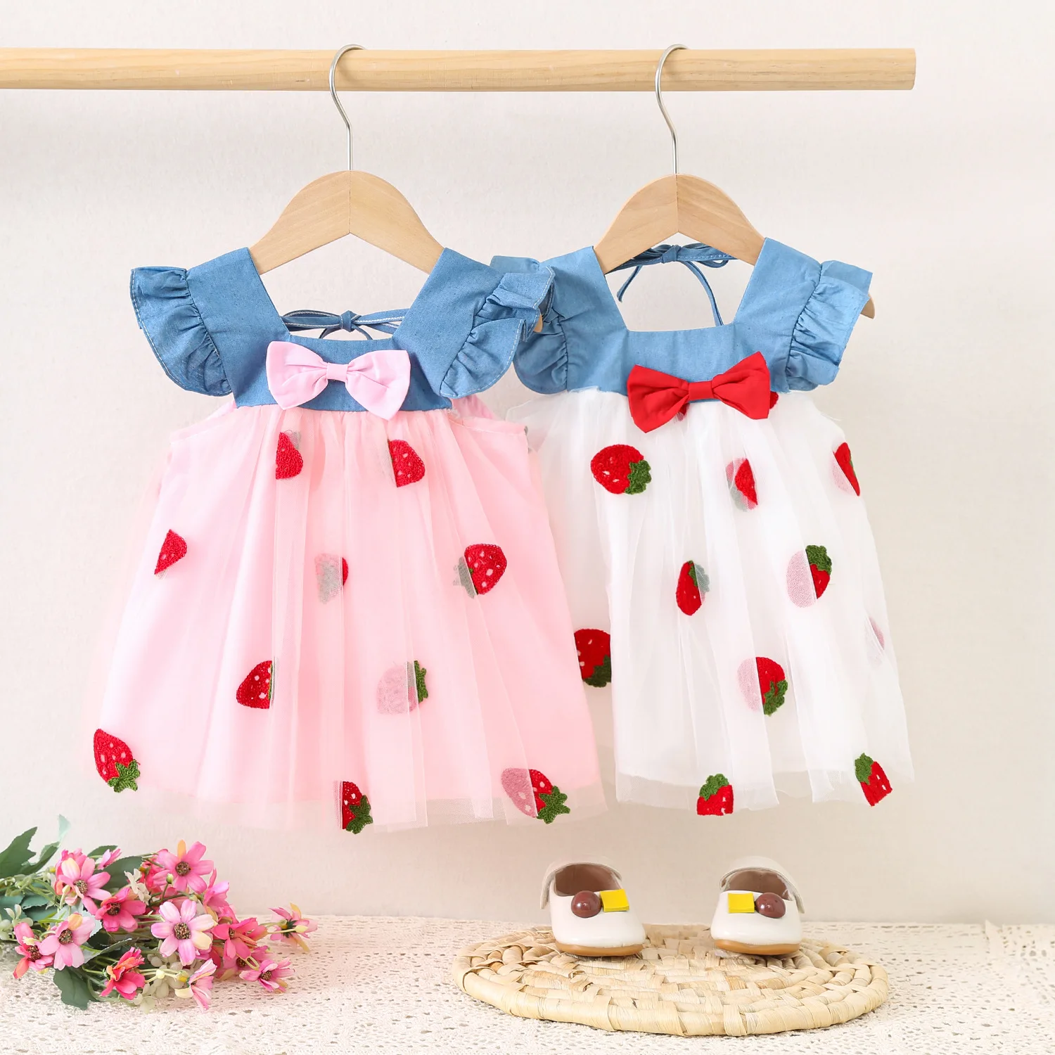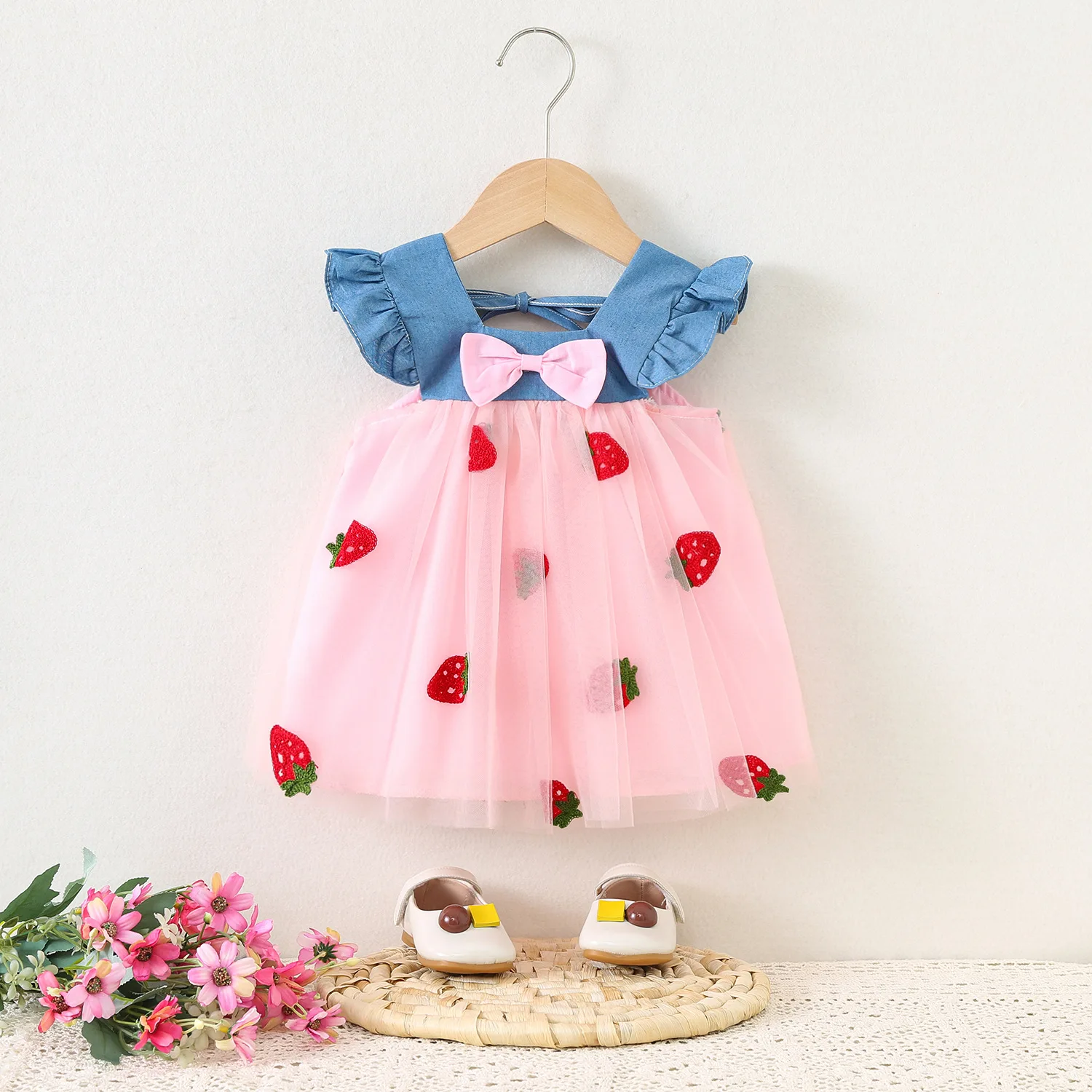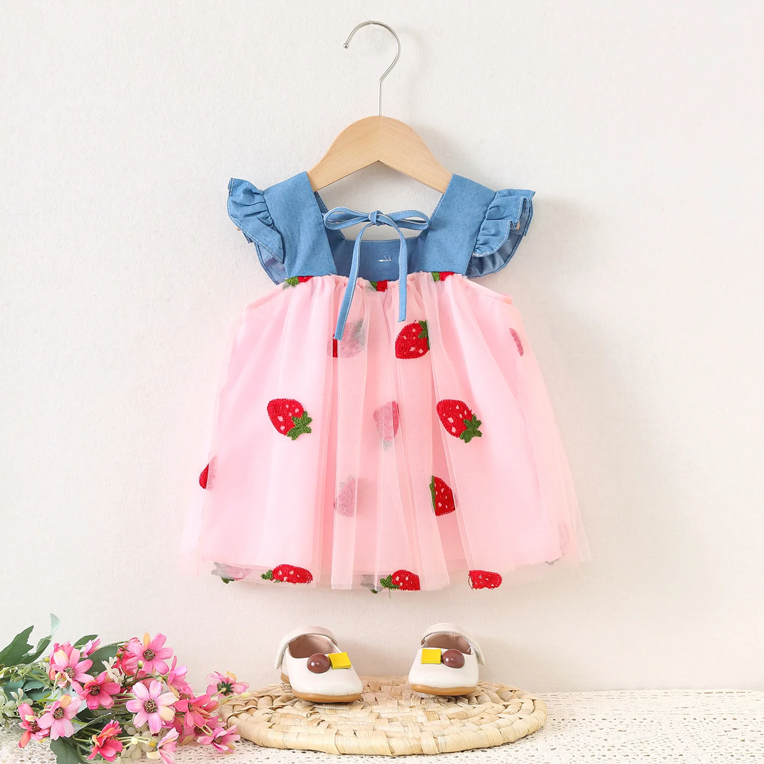 1 to 3 Years Beach Summer Girls Dress Cute And Sweet Denim Mesh Strawberry Embroidered Princess Dress Party Dress