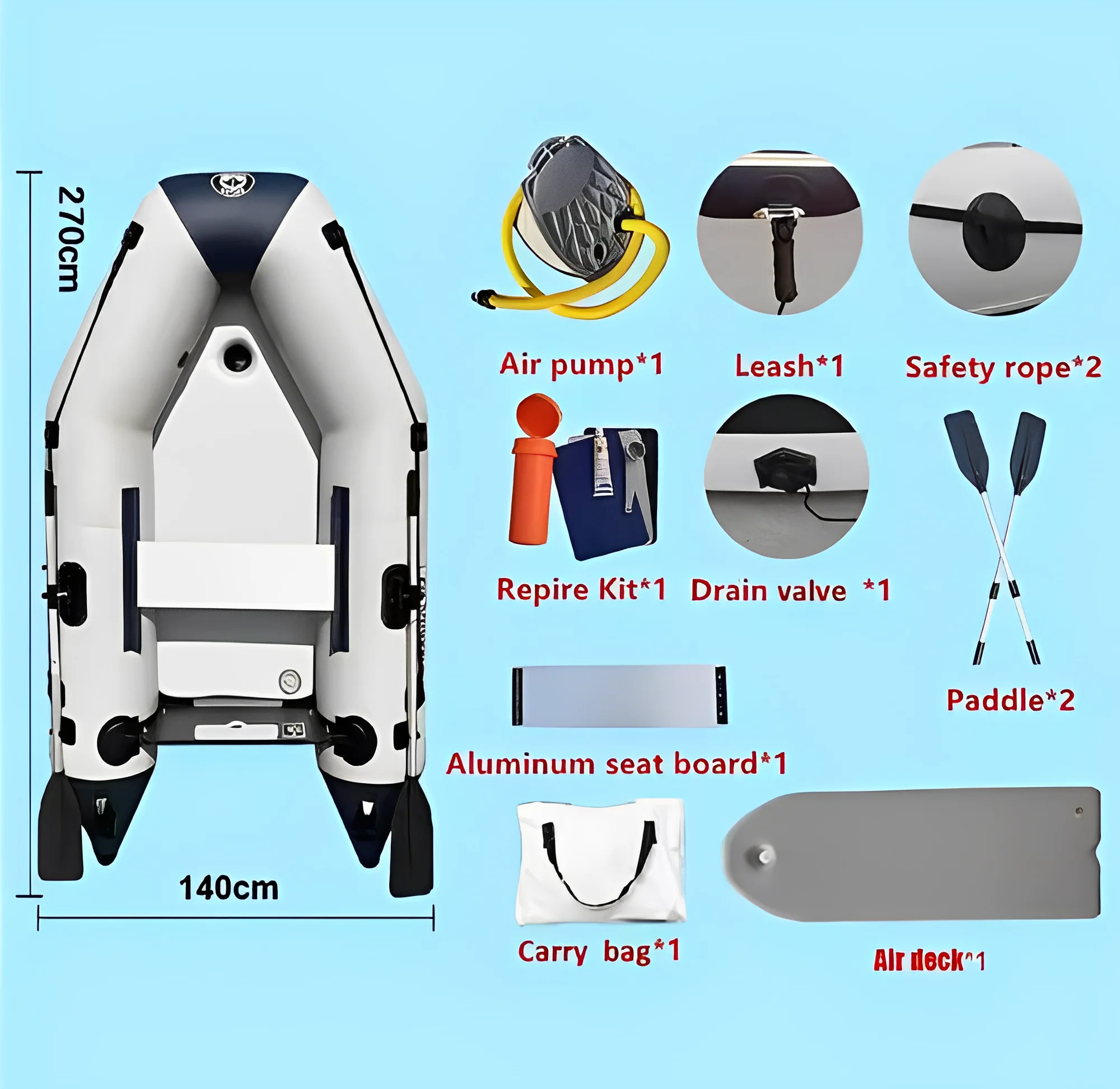 Main accessories:Air pump, Paddle,Repair kit,Backpack,Drain valve,Safety rope,Aluminum seat board,etc