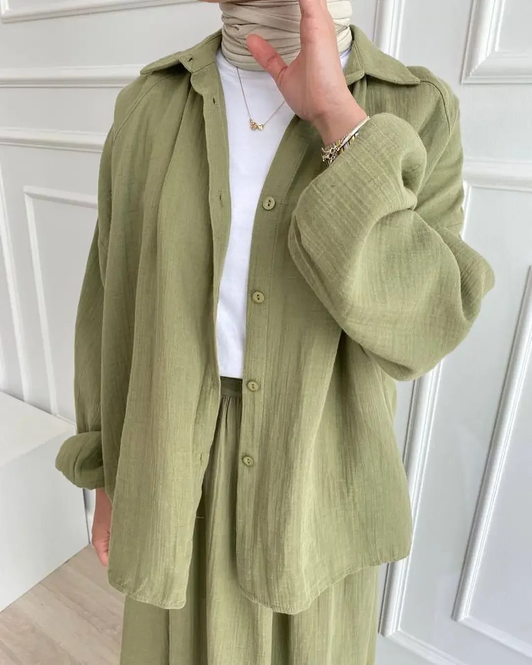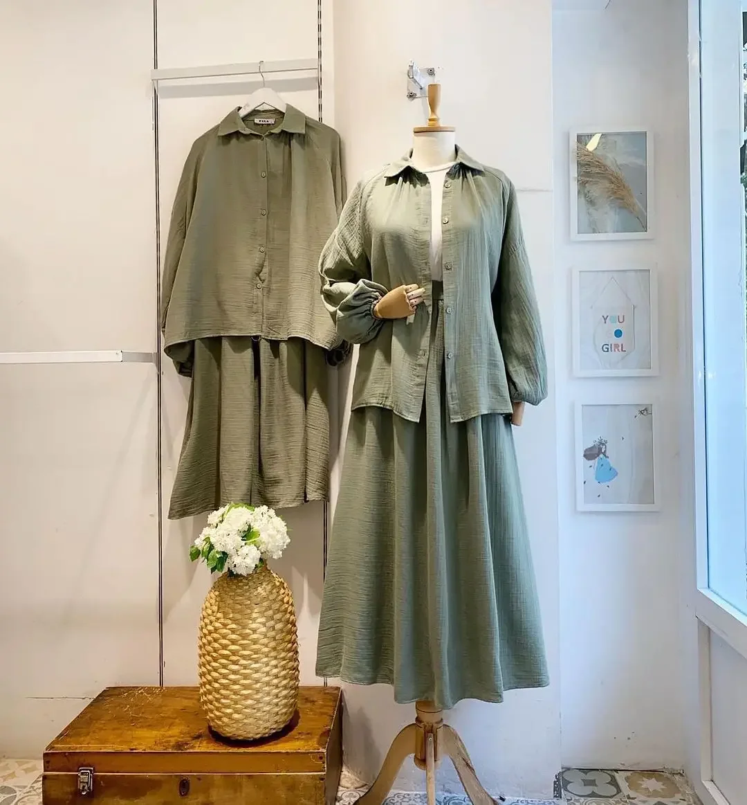 2 Piece Long Sleeve Shirt+Skirts Eid Muslim Women Elegant Sets Abaya Dubai Turkey Islamic Casual Tops Solid Color Skirt Fashion