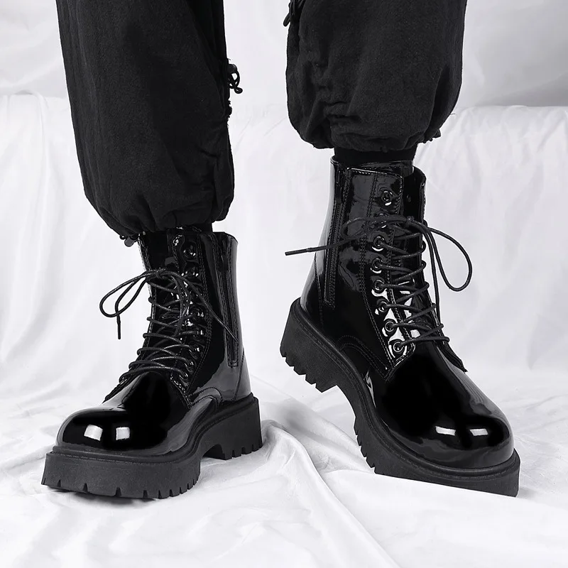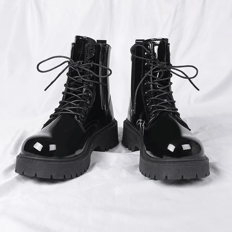 2025 New Men Black Patent Leather British Style Motorcycle Boot Couple Outdoors High Top Leather Waterproof Casual Leather Boots 2025 New Men Black Patent Leather British Style Motorcycle Boot Couple Outdoors High Top Leather Waterproof Casual Leather Boots