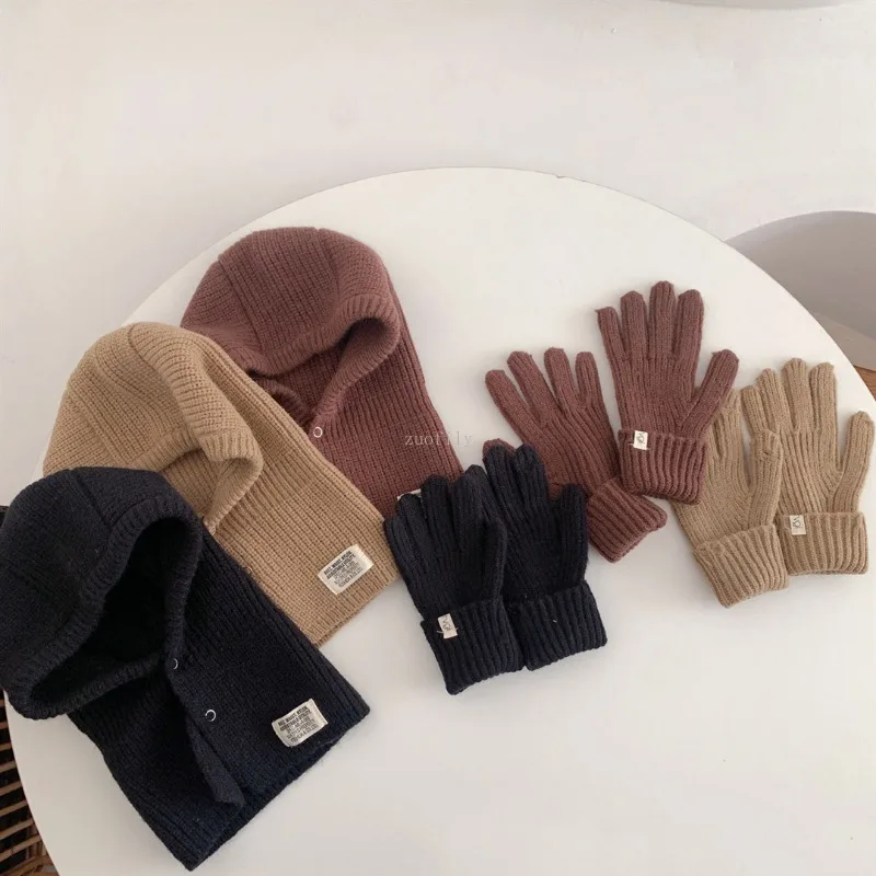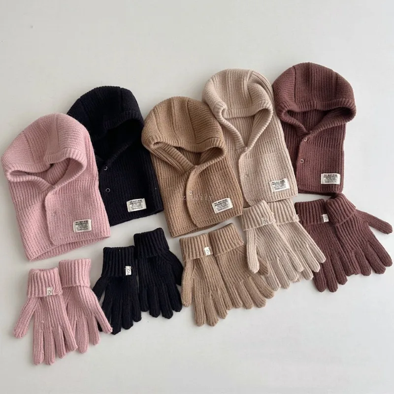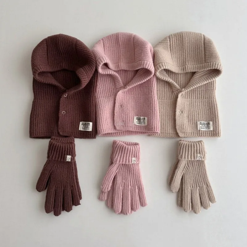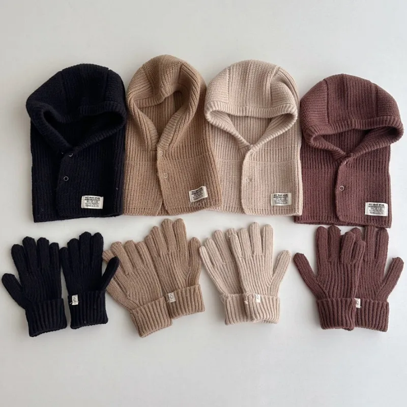 2PCS Korean Baby Hood Beanies with Mittens One Piece Scarf Cap Winter Warm Knitted Ear Protection Balaclava Headgear Gloves Sets