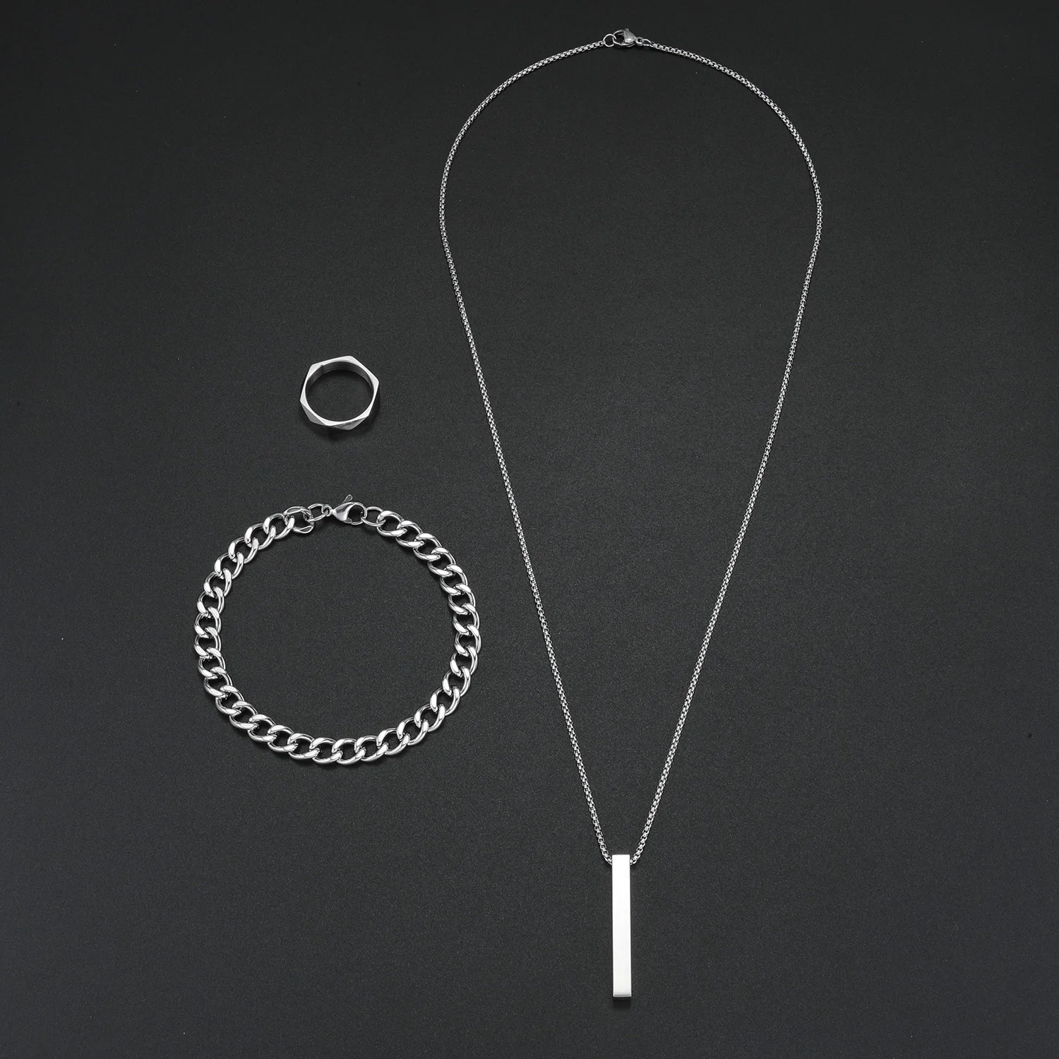 3pcs Stainless Steel Suit Jewelry Set For Men, Hip-hop Rectangle Pendent Necklace, Bracelet And Ring Set