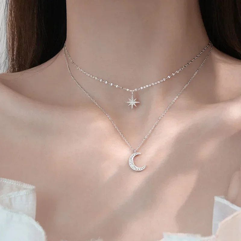 925 Silver Necklace for Women Double Layer Zircon Star Moon Pendant Necklace Delicate Chain Charm Elegant Fashion Jewelry Gifts