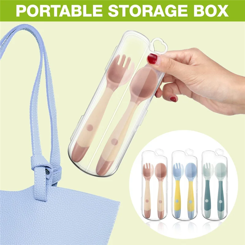 Reliable material, easy to carry: The baby training tableware with travel box is made of high-quality pp material, with smooth, soft and safe handles, no sharp corners, protecting the child’s delicate gums and teeth, and ensuring the safety of independent feeding for toddlers; the transparent travel box is convenient for outdoor carrying and can keep the fork and spoon clean and hygienic.