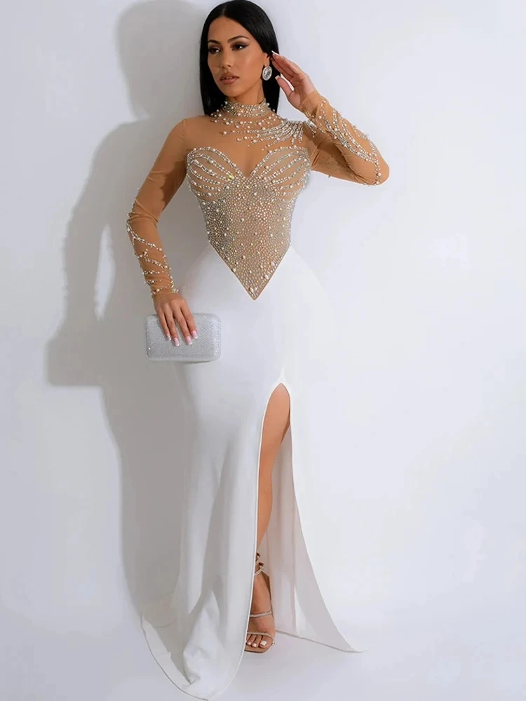 Beyprern Women’s Crystal Embellished High Slit Long Maxi Dress Gown Glam Long Sleeve Diamonds Party Dress Celebrities Outfits