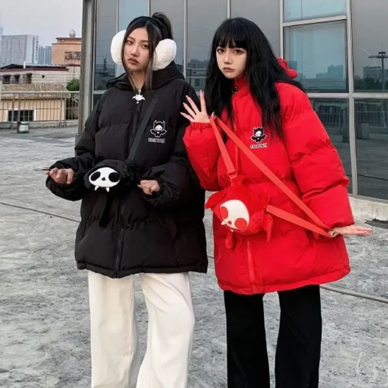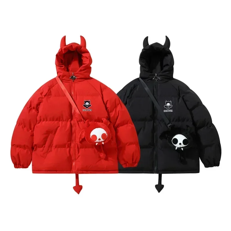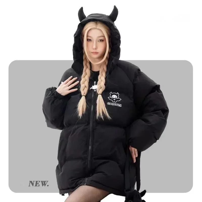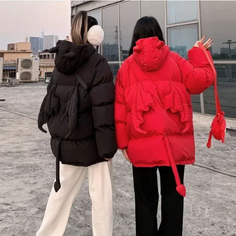 Creative high street winter warm down jacket little devil cartoon winged tail parka 2000s couple loose hooded bubble jacket