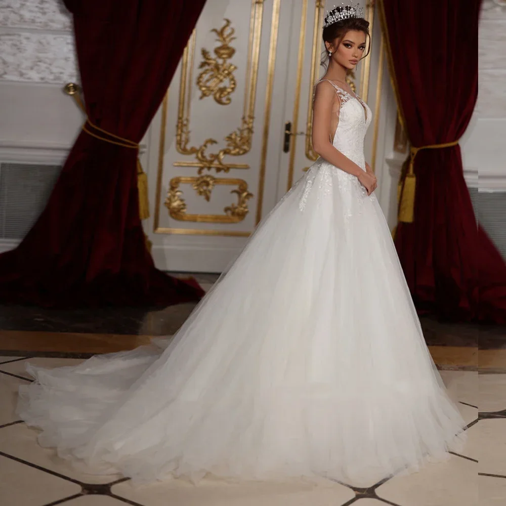 Customized Princess Tulle A-Line Wedding Dresses Sequined applique V-Neck Vestidos De Novia Backless Bridal Gown Hochzeitskleid