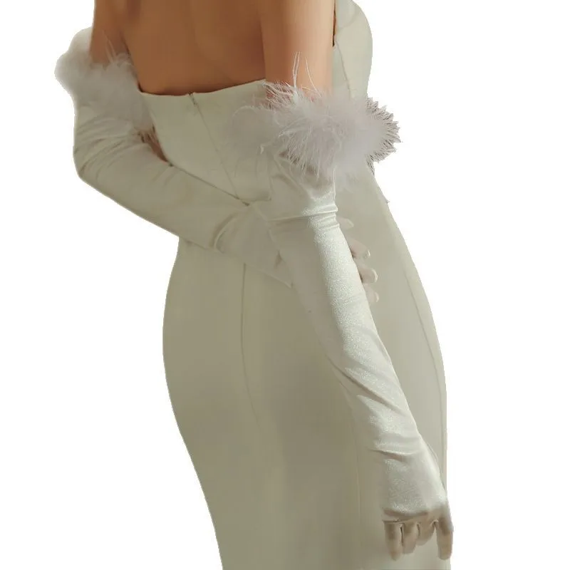 European and American Long Satin Feather Removable Bride Wedding Gloves Wholesale