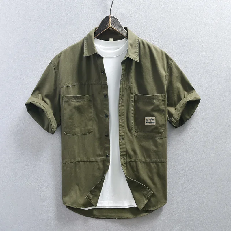 Japanese Fashion Men Cargo Shirt Summer Streetwear Loose Shirts Casual Double Pockets Tops 100% Cotton Short Sleeve Mens Shirts