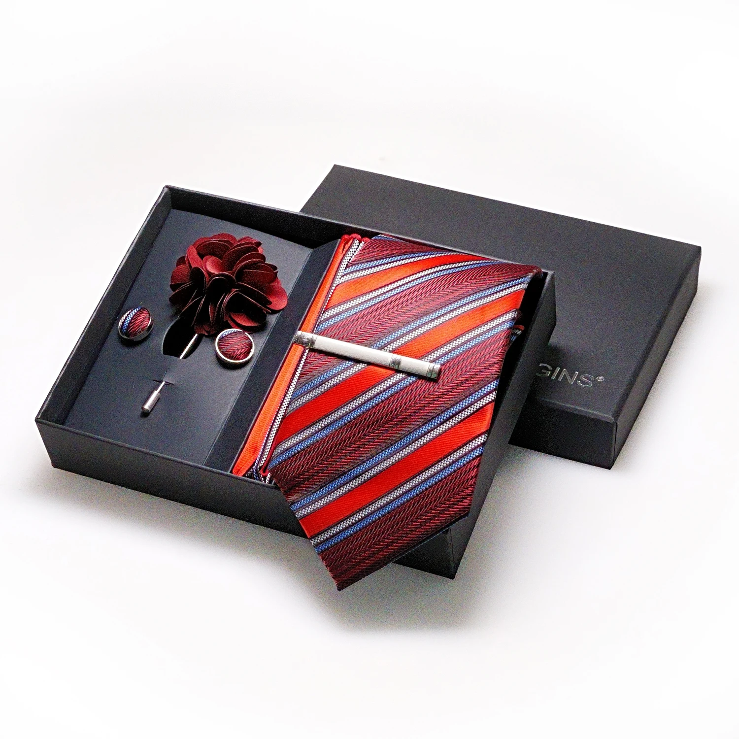 JEMYGINS Red Classic Silk Jacquard Necktie Pocket Square Cufflinks Sets Business Party Wedding Gravat Accessories Men Tie Set