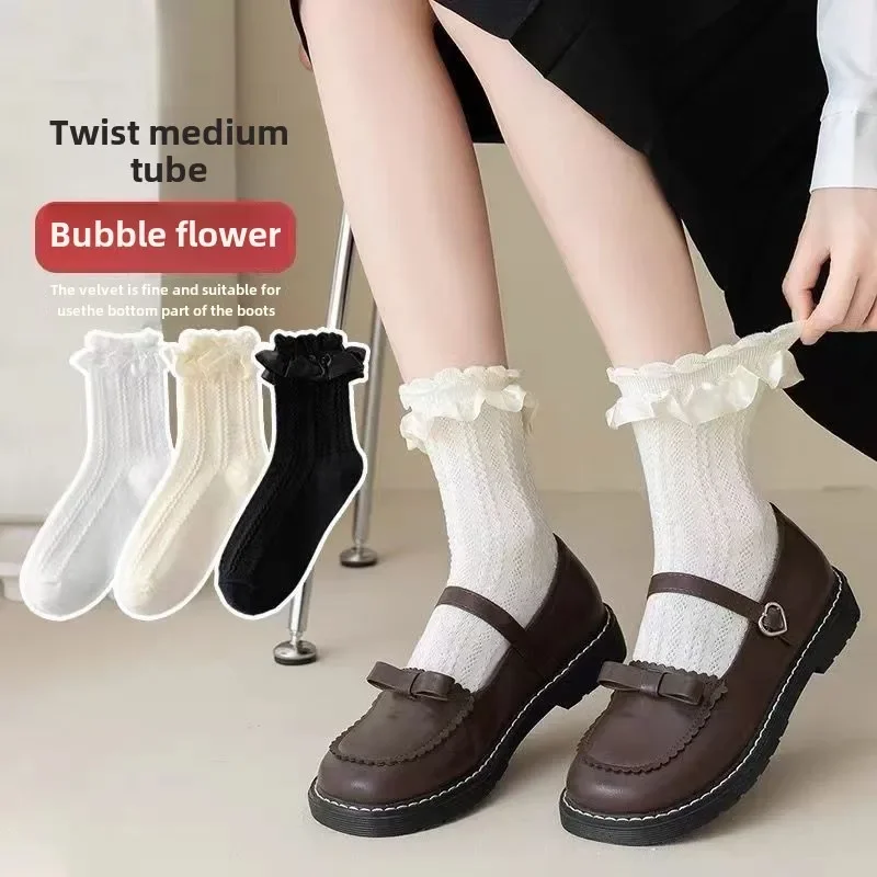 JK Japanese Lace Bow Ruffle Socks Kawaii Lolita Short Socks Cotton Socks Lacework Stockings Women’s Mid-tube Solid Stockings