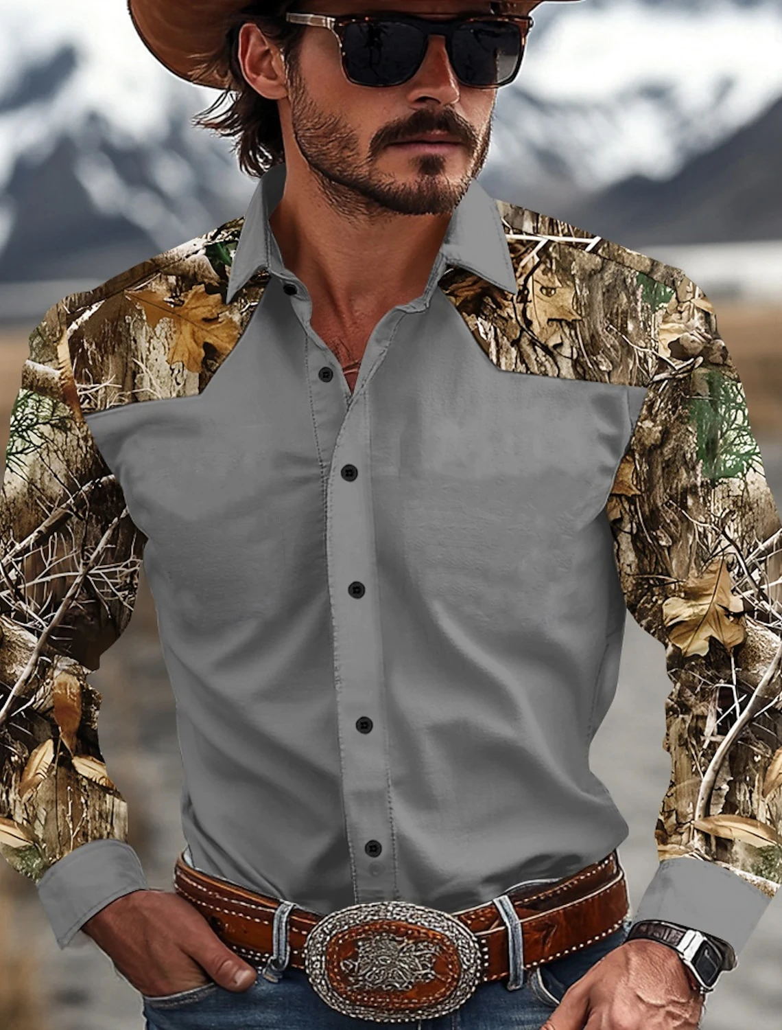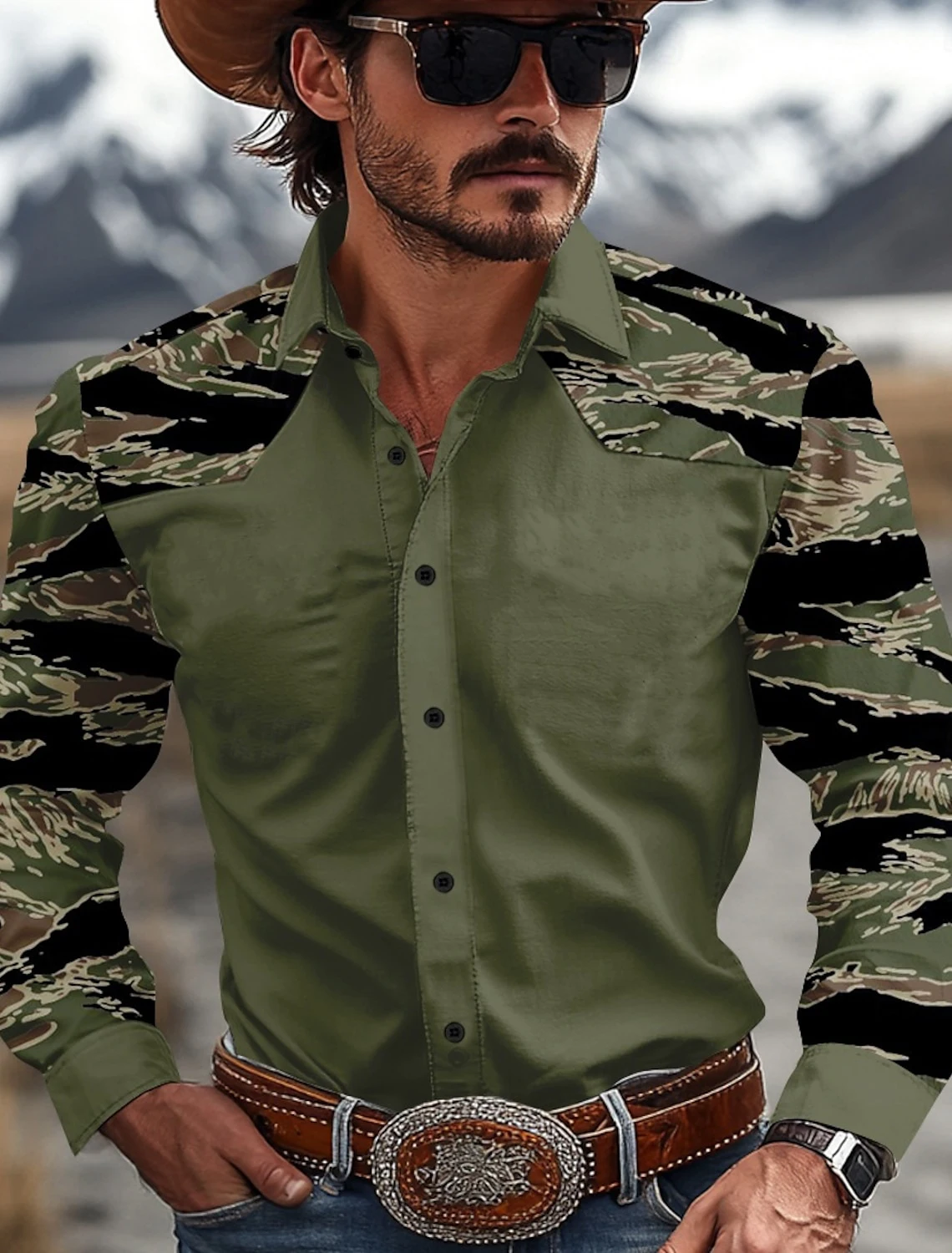 Men’s Camouflage Western Shirt Denim Shirt Long Sleeve Western Casual Outdoor Spring and Autumn Lapel Black Brown Green Khaki