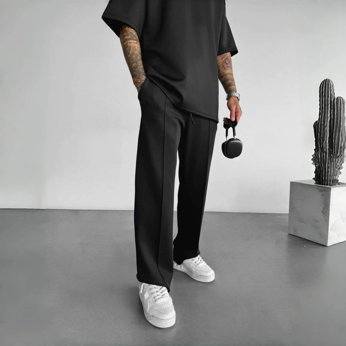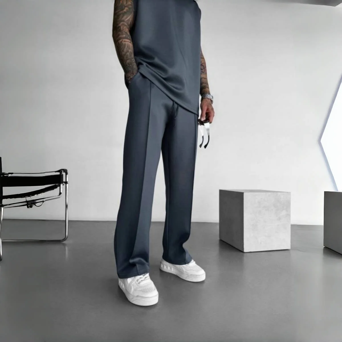 New men’s casual pants, stylish and comfortable elastic waist drawstring single-line pleated solid color pocket mops pants