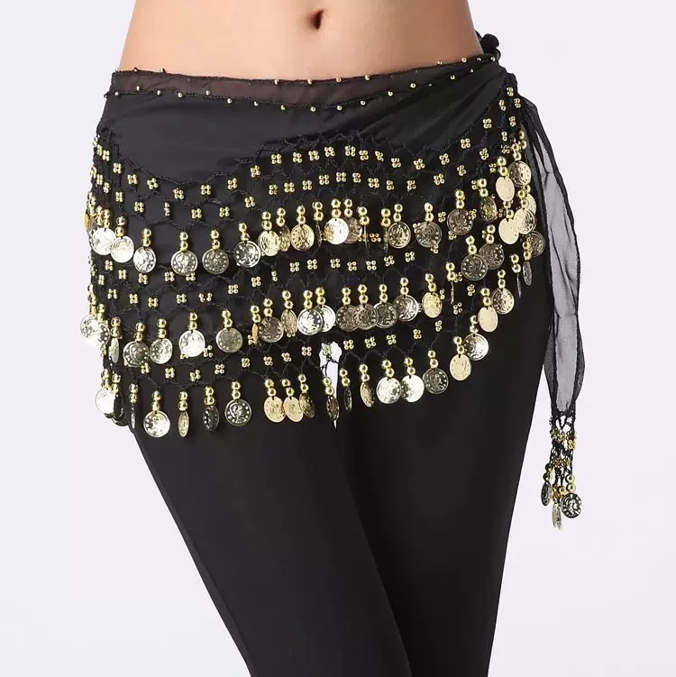 Sexy Women Belly Dance Chiffon Skirt Gold Sequins Waist Chain Tassel Belts Clubwear Indian Dance Practice Performance Hip Scarf