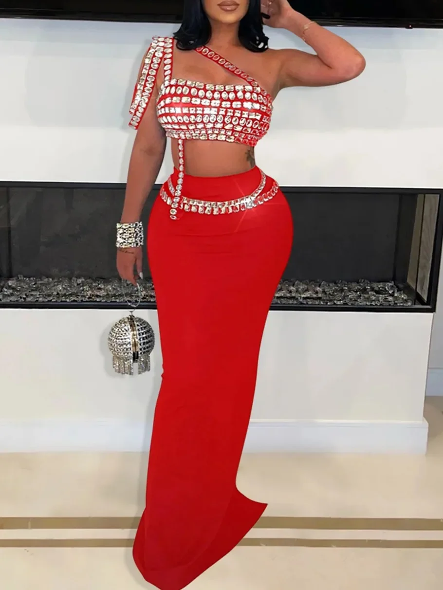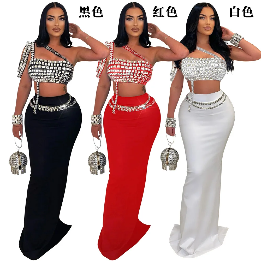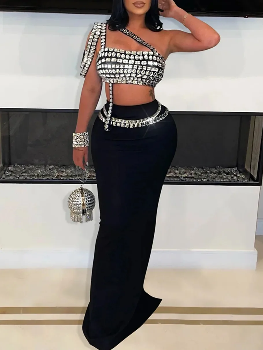Sparkly Diamonds Tube Top Long Skirt Two Pieces Set for Women Sexy Celebrate Evening Prom Birthday Photo Shoot Dress Stage Wear