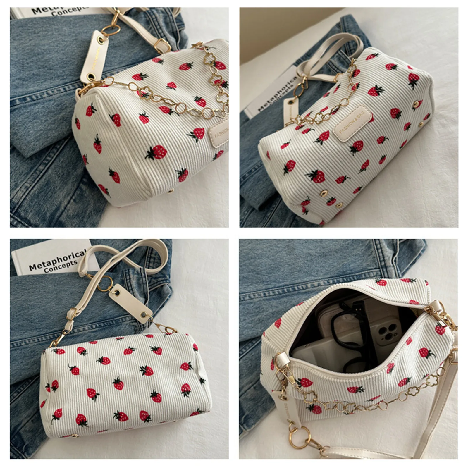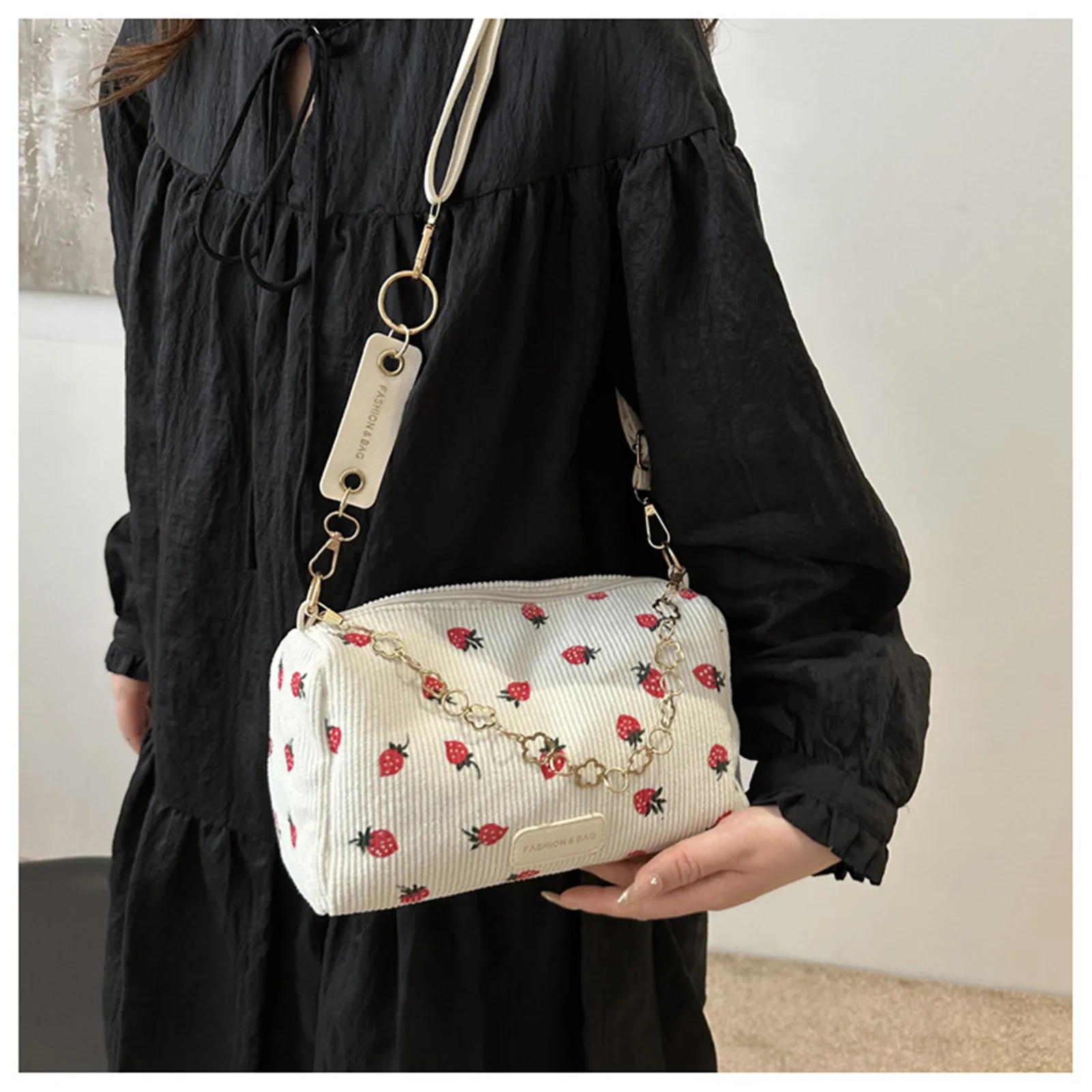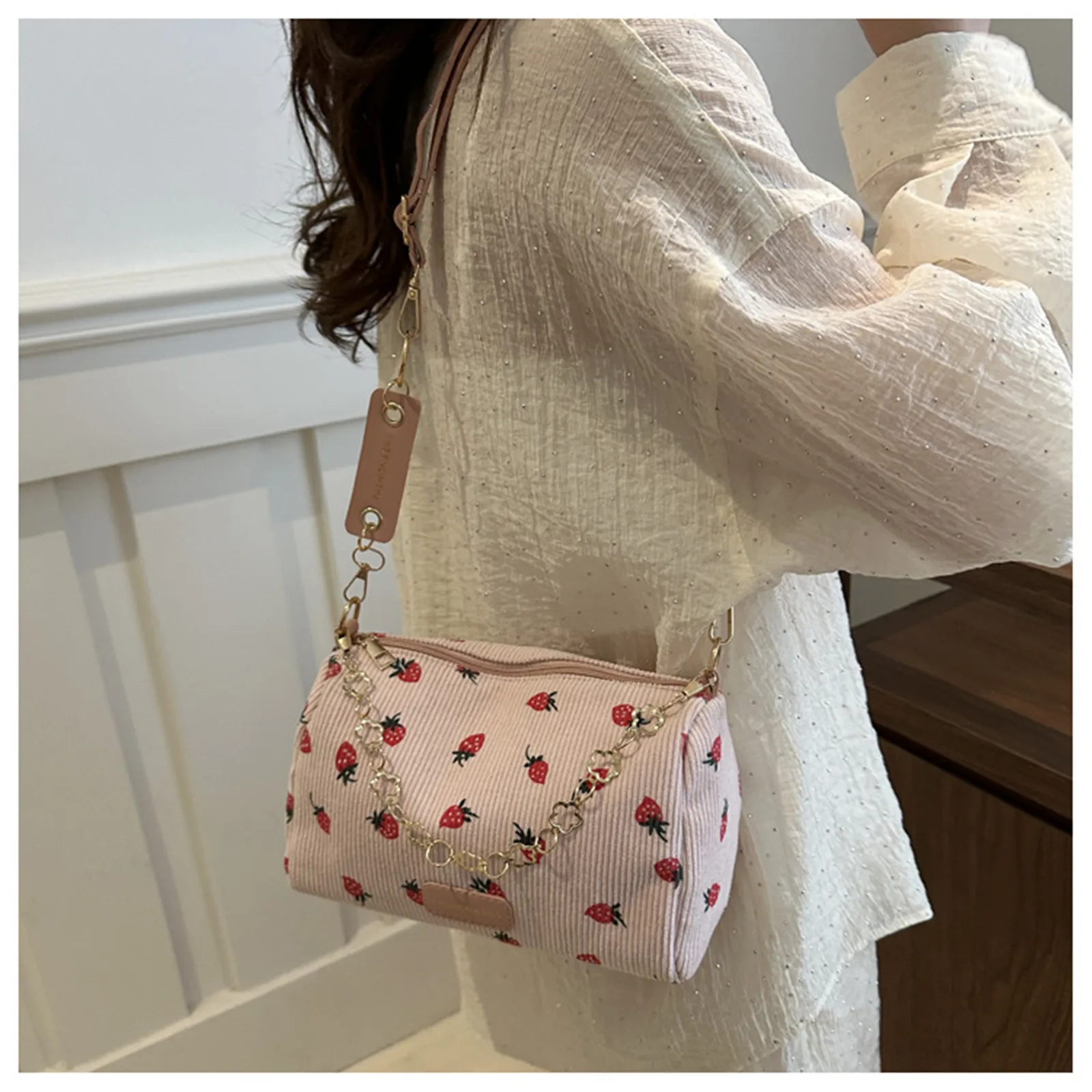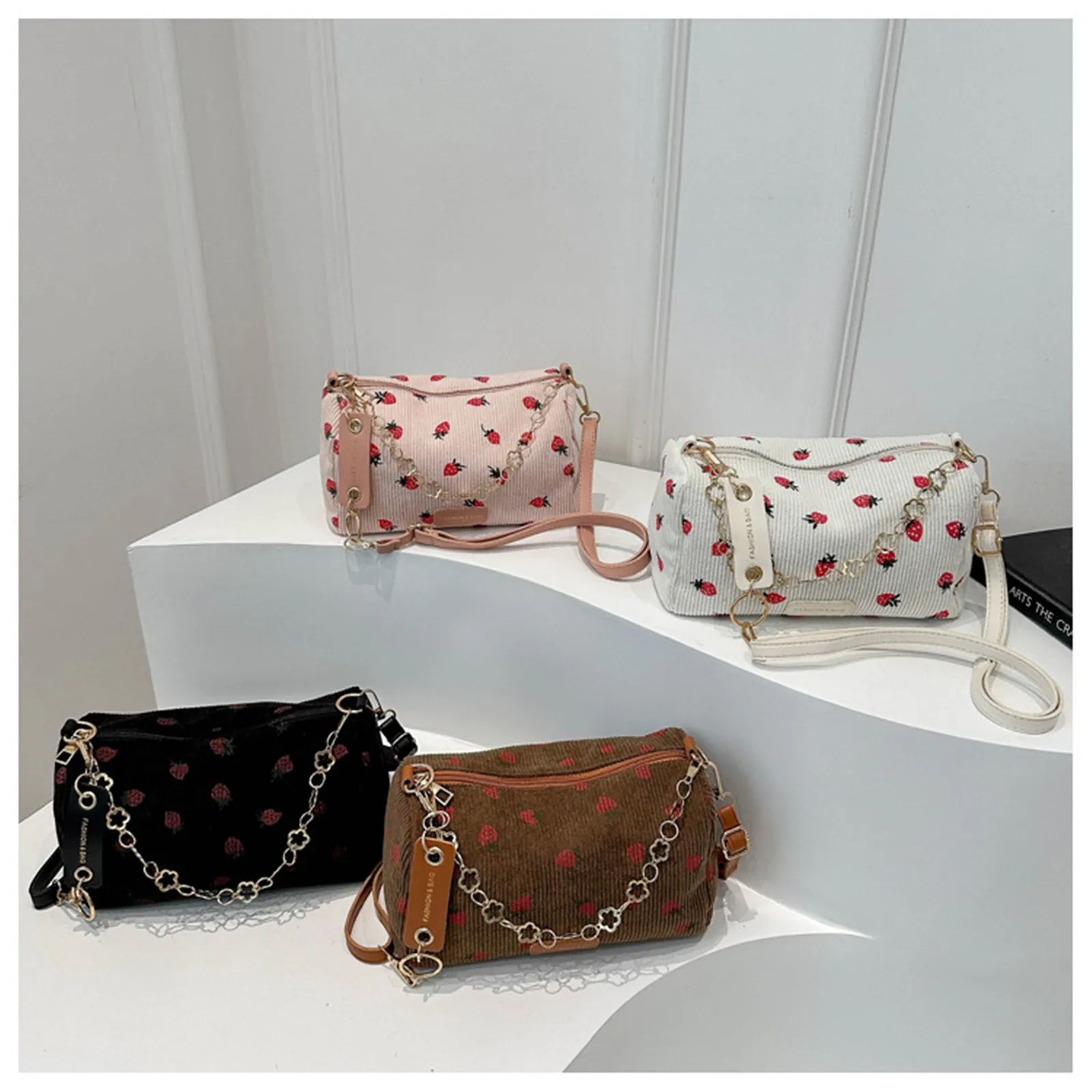 Strawberry Print Cute Crossbody Bag Corduroy Underarm Bag Casual Simple Women Student Shoulder Bag Trend Messenger Bag Handbag