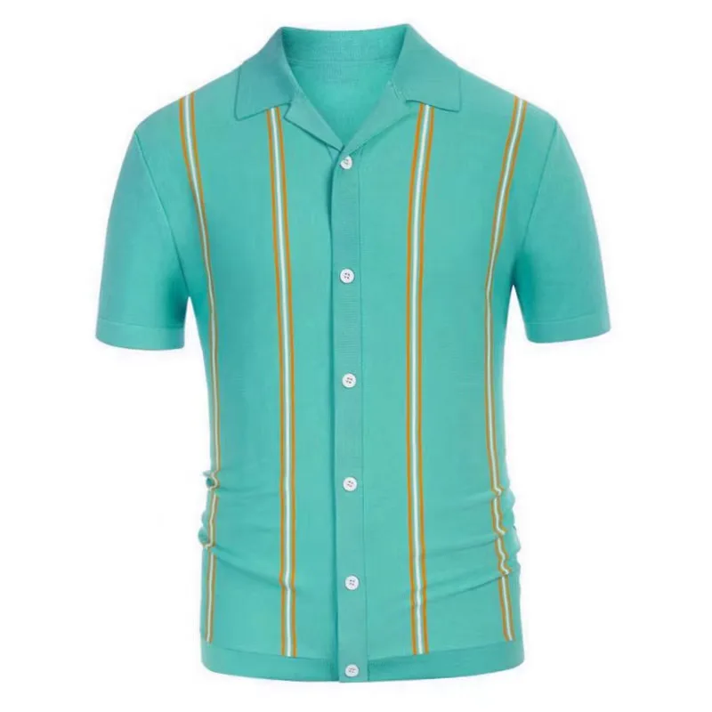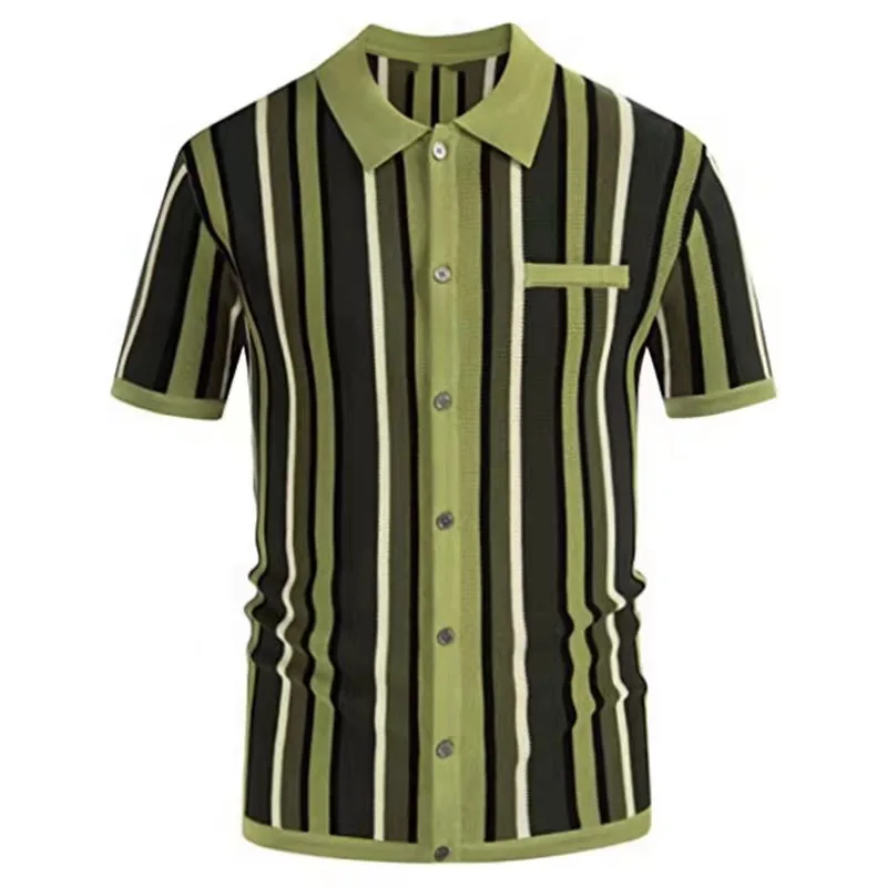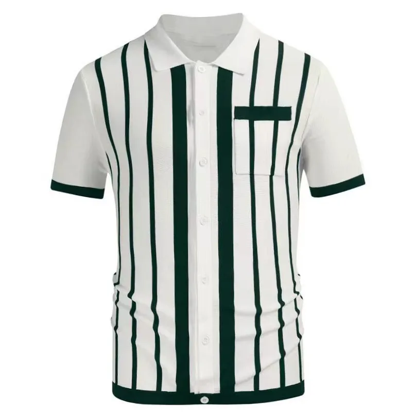 Summer Men Luxury Clothing Knit Short Sleeve Polo Shirt Casual Classics Stripes Lapel Button Slim Fit Cardigan Breathable Tops
