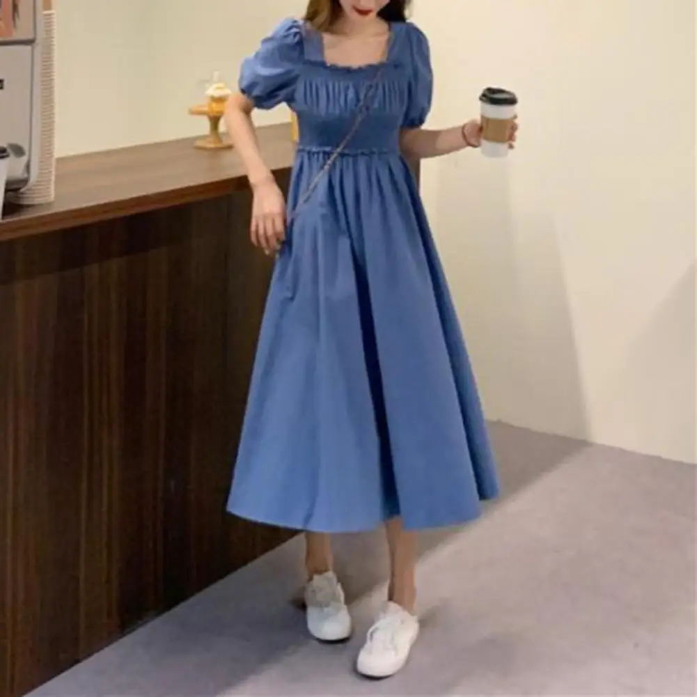 Women Summer Dress Square Neck Bubble Sleeve Pleated Shirring Elastic Bust Short Sleeve A-line Loose Hem Solid Color Vintage Mic-calf Length Midi Dress