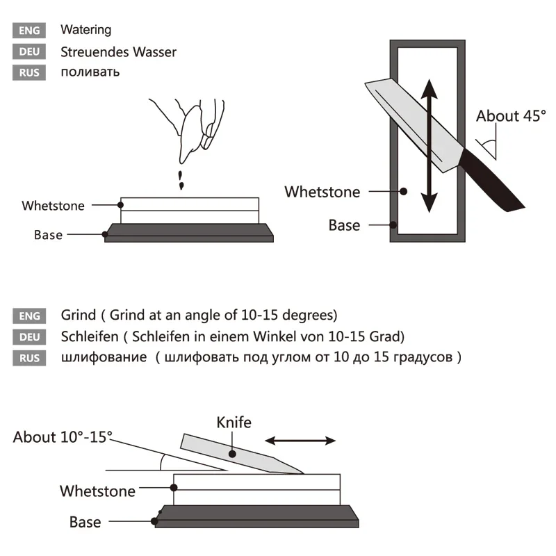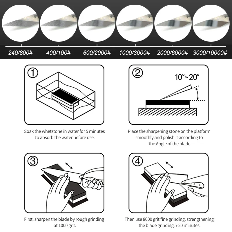 1. Soak the stone in the water for 5 minutes, and then put it on a steady platform. Sharpening the knives with one or two steps is decided by the degree of blunt tool.