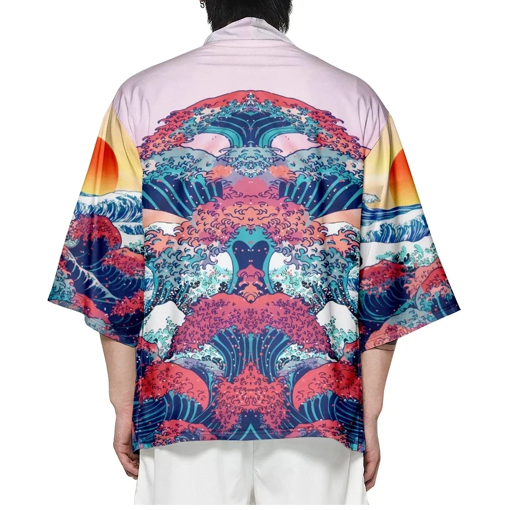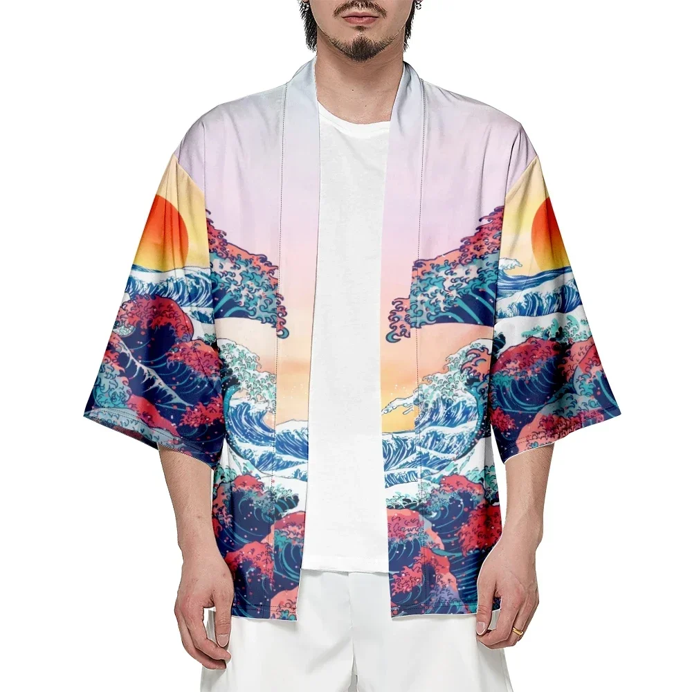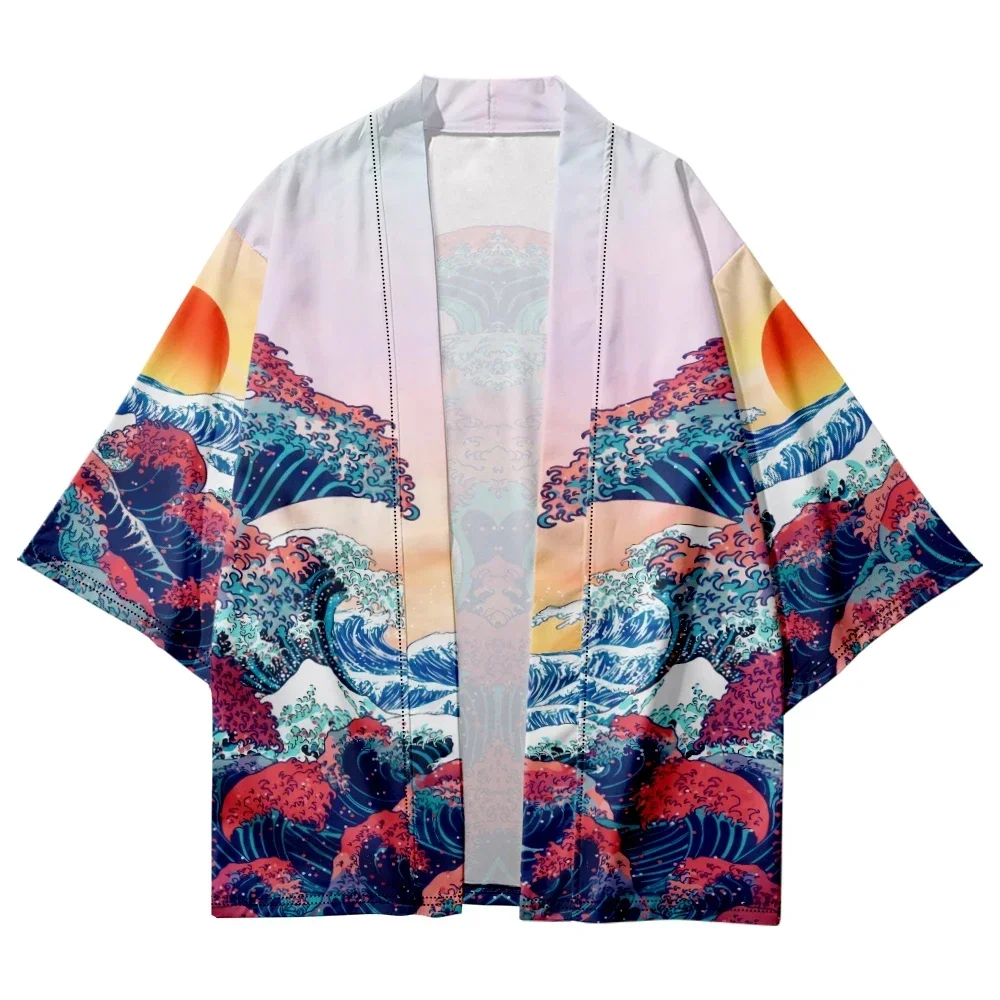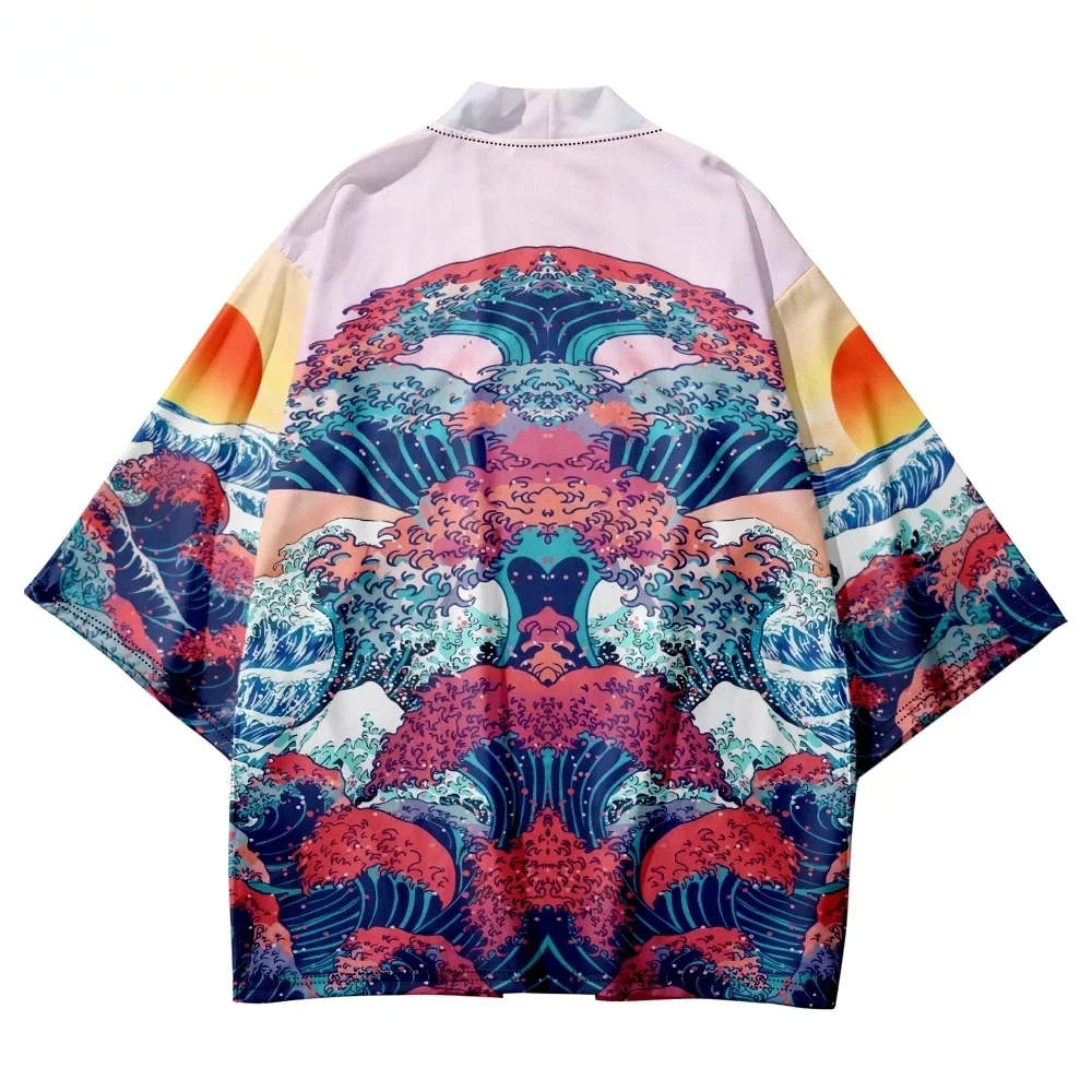 Vintage Japanese Style Waves Print Kimono Shirt Clothing Traditional Haori Women Men Streetwear Cardigan Yukata Cosplay Tops