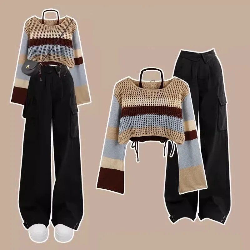 Women’s Spring Vintage Hollow Stripe Long Sleeved Knitwear+Strap+Cargo Pants Suit Korean Elegant Sweater Trousers Matching Set